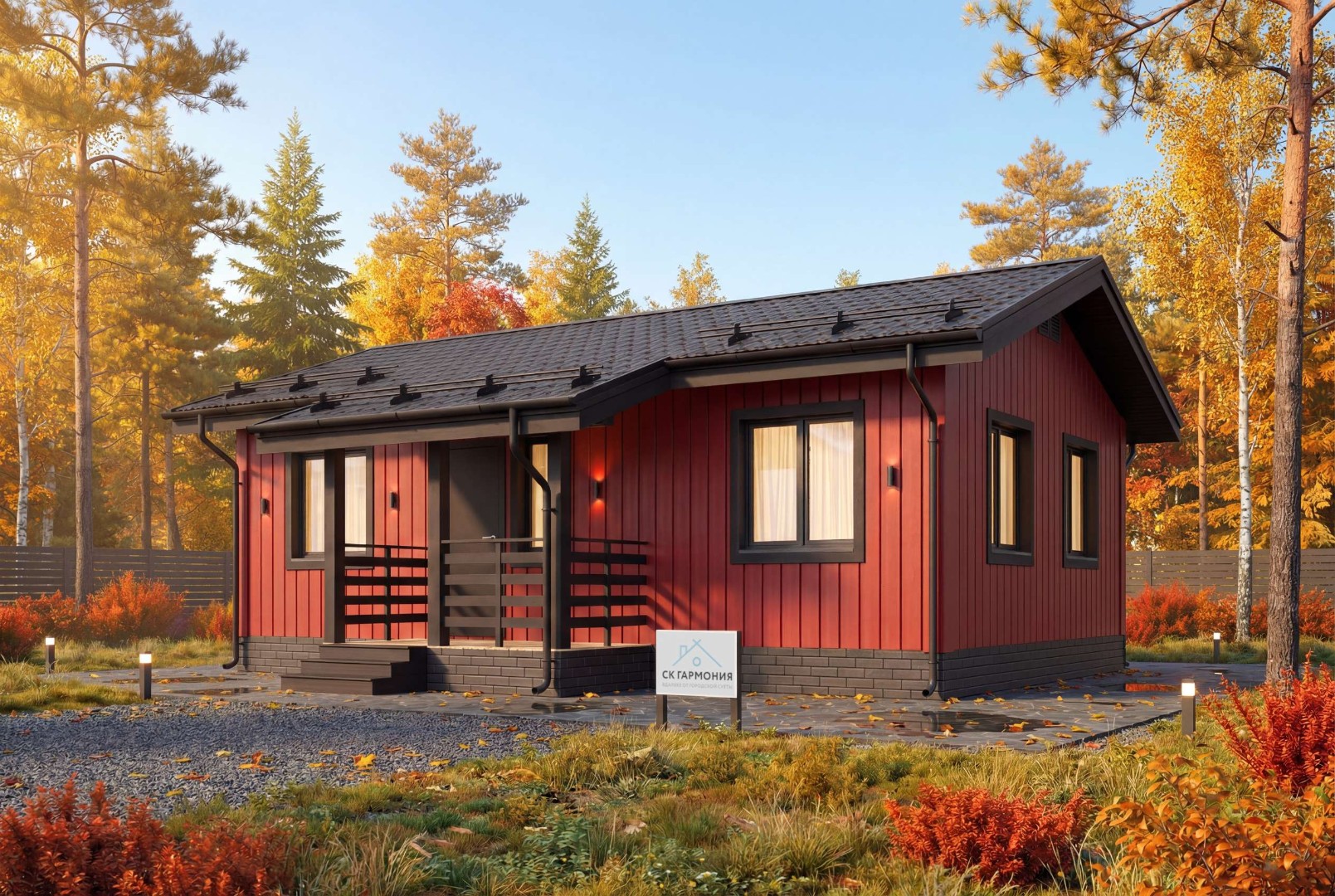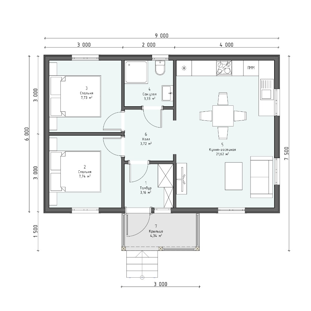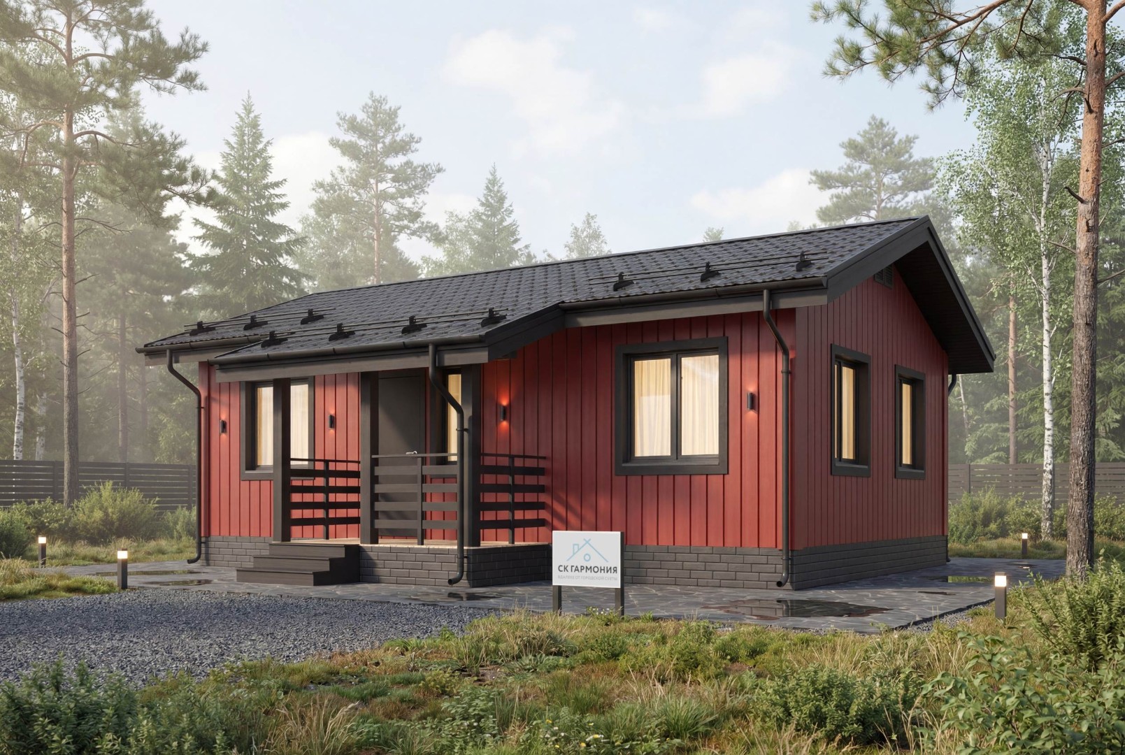 Проект дома «Троицк» представляет собой элегантный одноэтажный дом с террасой, из экологически чистых материалов, который подходит для постоянного проживания. Строительство одноэтажного дома под ключ в Пскове и Псковской области потребует сроки до 20 дней. Вы можете заказать строительство без отделки или с чистовой отделкой и коммуникациями.
