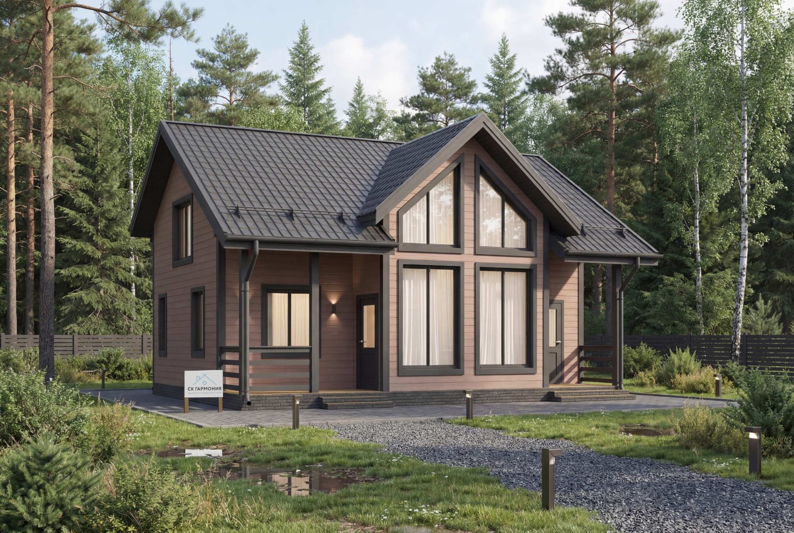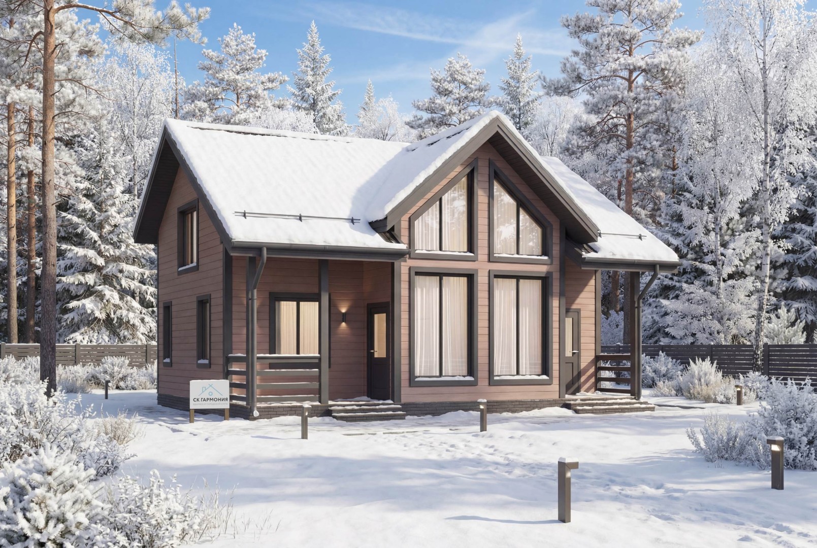 В стоимость дома не входит. Рассчитывается отдельно. Стоимость и тип фундамента зависят от проекта, от типа грунта и перепада высот на участке.